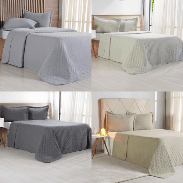Produzido com tecido de toque macio e agradável, o kit proporciona conforto térmico na medida certa, sendo perfeito para uso durante todo o ano. Sua colcha possui caimento impecável, enquanto os porta-travesseiros complementam o visual do quarto com harmonia e charme.
