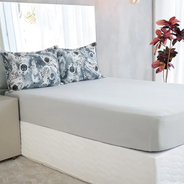 O Jogo de Lençol de Malha Estampa Yuri é a escolha ideal para quem deseja unir conforto, qualidade e estilo na composição da cama. Sua estampa exclusiva traz ilustrações espaciais com astronautas, planetas, foguetes e estrelas, em tons de azul e cinza sobre fundo azul suave, criando um visual lúdico que inspira aventura e imaginação.