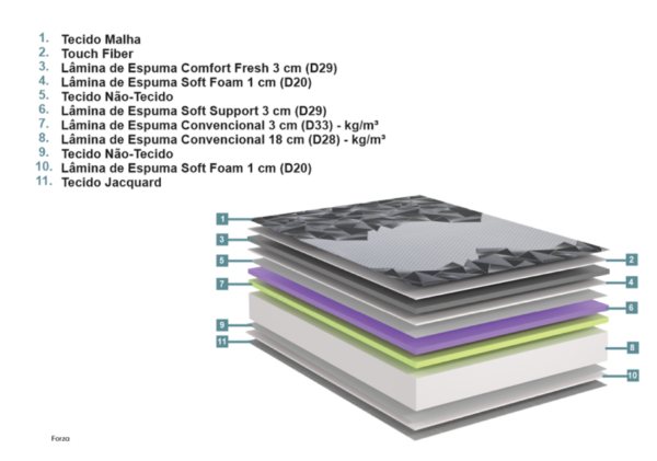 ✔ Espuma Fresh: garante frescor e ventilação durante a noite devido a suas células abertas, combinando elasticidade, maciez e suporte necessários para garantir mais conforto.