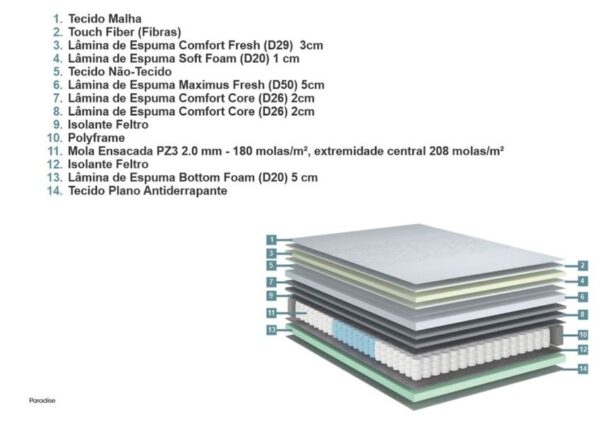 O colchão Paradise Fresh possui tecnologia avançada para oferecer conforto firme e sustentação equilibrada.