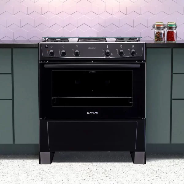 O forno é amplo e eficiente, com capacidade de 86,5 litros, ideal para assar grandes receitas com facilidade. Conta com visor amplo na porta, acabamento limpa fácil, 1 grade deslizante e porta com vidro duplo, que ajuda a preservar o calor interno e melhora a eficiência térmica. Um fogão completo, robusto e elegante, perfeito para quem valoriza qualidade e desempenho no dia a dia, com a tradição e confiança da Atlas.
