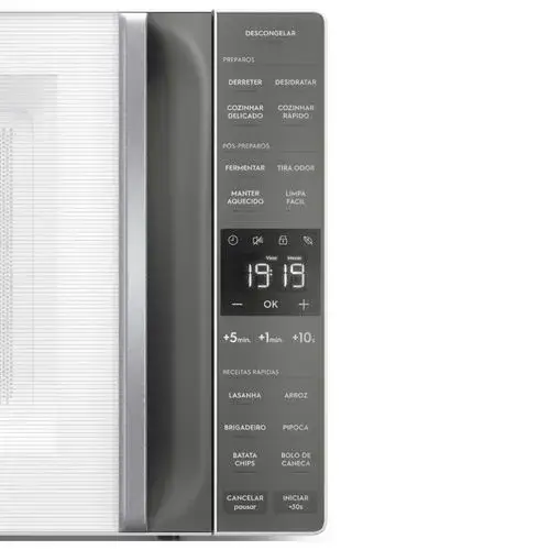 O micro-ondas também conta com a função Manter Aquecido, mantendo os pratos quentes até o momento de servir, e Tira Odor, que utiliza a recirculação do ar para eliminar cheiros de preparos anteriores.