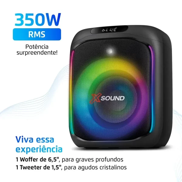A conectividade é completa e moderna: com Bluetooth 5.0, a conexão é rápida, estável e sem interferências. Além disso, a caixa possui entradas USB, auxiliar, micro SD e entrada para microfone, perfeita para animar festas com karaokê. A tecnologia TWS permite conectar duas Party Box PBX-350, sincronizando som e iluminação para uma experiência ainda mais imersiva.