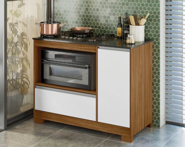Sua estrutura em MDP de 15mm garante durabilidade e estabilidade para o uso diário, enquanto a prateleira interna proporciona um ótimo espaço para armazenar utensílios, panelas ou mantimentos, mantendo tudo sempre ao alcance das mãos. Com design versátil, o balcão se adapta facilmente a diferentes estilos de cozinha, sendo ideal tanto para ambientes planejados quanto para composições moduladas.