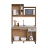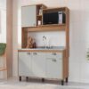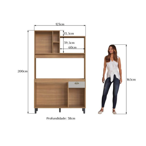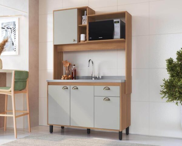 O móvel conta com 4 portas e 1 gaveta com corrediça metálica, proporcionando fácil acesso e boa capacidade de armazenamento para utensílios e mantimentos. Possui ainda 2 nichos funcionais e espaço compatível para micro-ondas, garantindo mais praticidade no dia a dia.