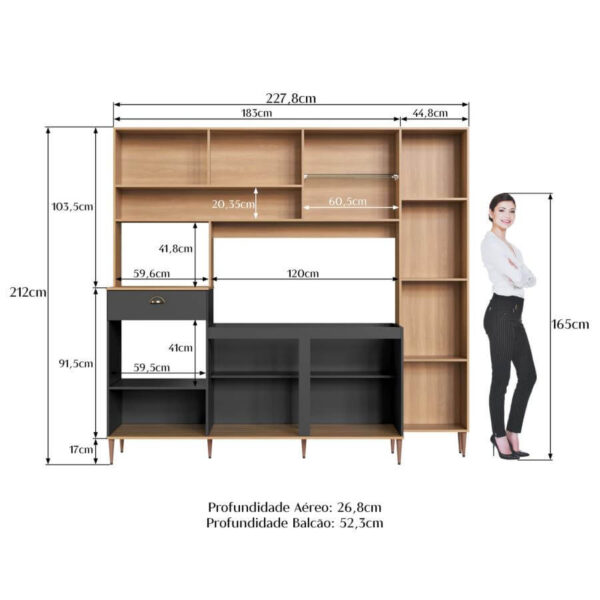 Produzida em MDP de 15mm, a Cozinha Karina traz ainda prateleiras decorativas de vidro, que agregam charme e leveza ao visual. Os pés plásticos com regulagem de altura facilitam o nivelamento no piso, enquanto os puxadores ponto e concha na cor ouro dão um toque sofisticado e especial ao ambiente.
