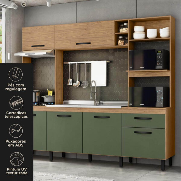 A combinação Freijó/Jade traz elegância e aconchego ao ambiente, deixando sua cozinha mais bonita e funcional.