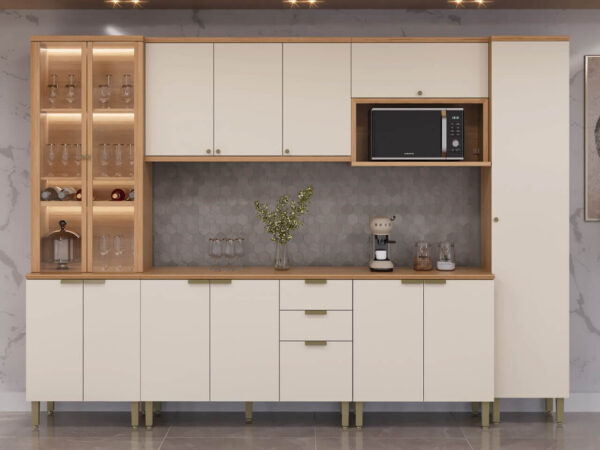 O conjunto conta com um paneleiro, que amplia o espaço de armazenamento, além de um aéreo para micro-ondas, pensado para otimizar o layout da cozinha. O grande destaque fica por conta da cristaleira com garrafeiro, perfeita para organizar taças, bebidas e objetos decorativos, trazendo charme e funcionalidade ao ambiente.