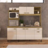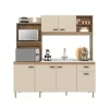 Seu amplo espaço interno conta com 6 portas bem distribuídas, ideais para organizar utensílios, mantimentos e louças de forma prática. Os nichos superiores oferecem espaço perfeito para micro-ondas, eletrodomésticos e itens decorativos, enquanto o balcão proporciona apoio funcional para a rotina diária.