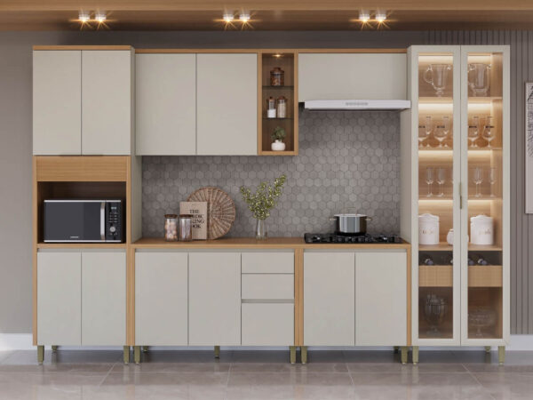 O grande destaque do conjunto é a cristaleira com iluminação em LED e garrafeiro integrado, ideal para expor taças, bebidas e itens decorativos com charme e sofisticação. A cozinha também conta com uma torre com detalhe canelado, que agrega personalidade ao projeto, além de um armário aéreo com nichos e iluminação por spot, perfeito para destacar objetos e facilitar a organização.