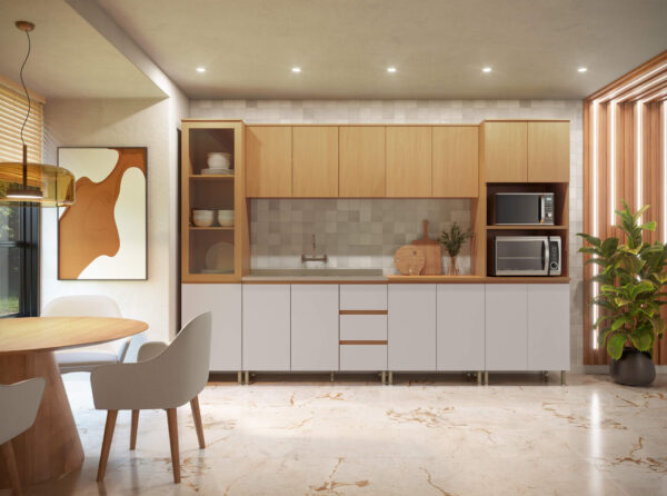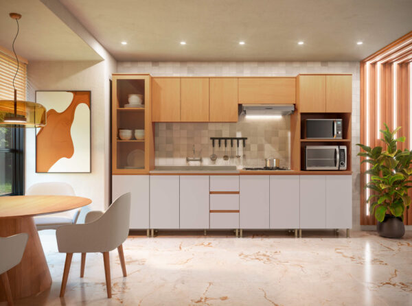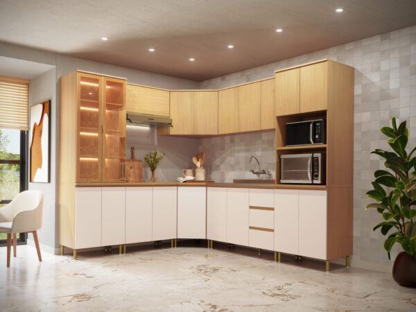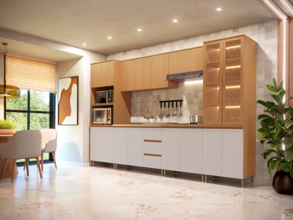 Conta com painel com porta de vidro, trilhos telescópicos que garantem um deslizamento suave e eficiente das gavetas, além de pés com regulagem de altura para melhor nivelamento e adaptação ao espaço. Outro grande diferencial é a variedade de modulações disponíveis, permitindo montar a cozinha de acordo com suas necessidades, aproveitando cada centímetro do ambiente.