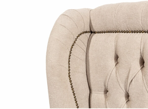 Com abas laterais estofadas, também com acabamento em tachas, a peça se destaca ainda mais, trazendo um charme exclusivo e um toque de luxo ao ambiente. Produzida com estrutura em madeira de eucalipto, garante alta resistência e durabilidade para o uso diário.