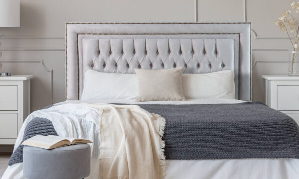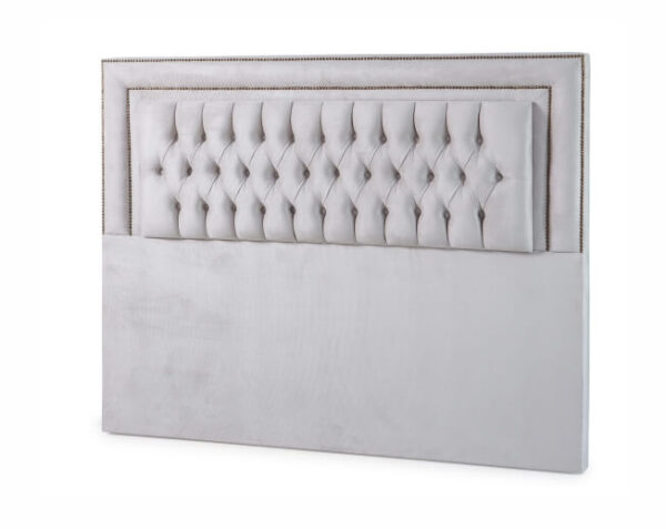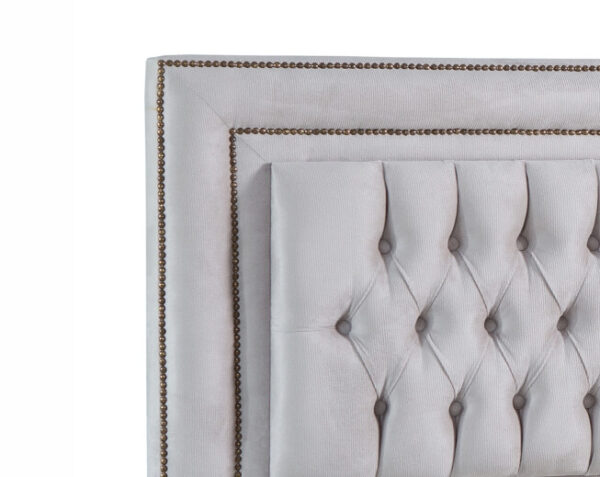 Seu diferencial está no acabamento em moldura com tachas, que cria um efeito imponente e destaca ainda mais a peça no quarto. Produzida com estrutura em madeira de eucalipto, garante resistência e durabilidade, sendo ideal para o uso diário.