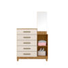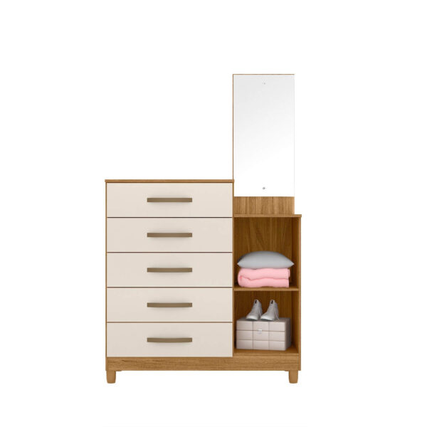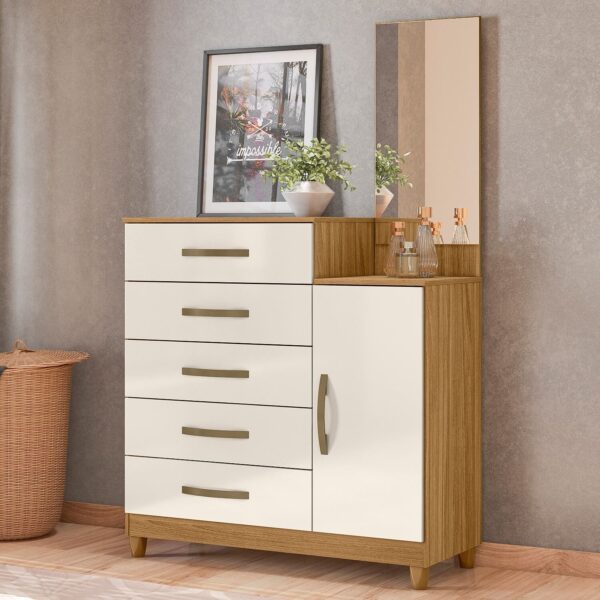 Ela conta com 5 gavetas amplas equipadas com corrediças telescópicas, que garantem abertura suave, resistência e facilidade no uso diário, ideais para armazenar roupas, acessórios e itens pessoais. Os puxadores em MDF complementam o visual com um toque moderno e discreto.