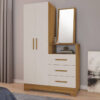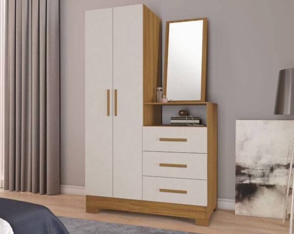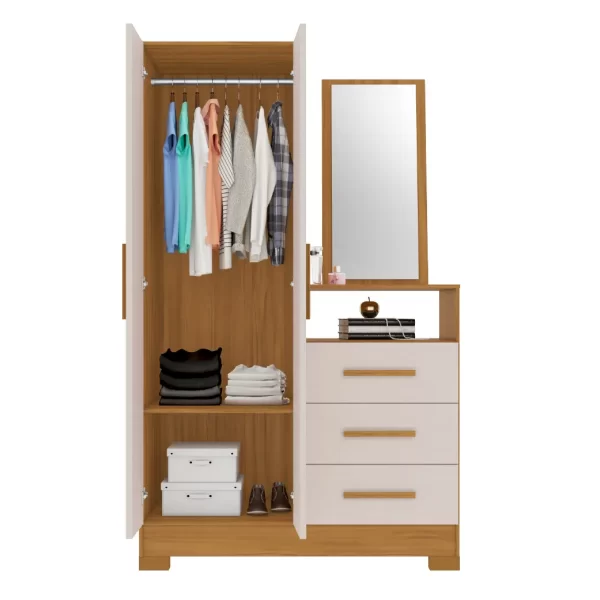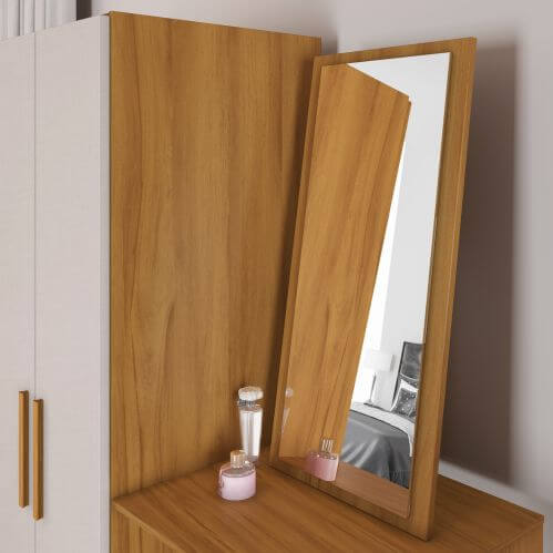 Um dos grandes destaques é o espelho inclinado, que proporciona mais conforto visual e praticidade no uso diário, ideal para se arrumar com mais facilidade. O móvel conta ainda com cabideiro interno, ampliando as possibilidades de organização para roupas, acessórios e peças que precisam ficar penduradas.
