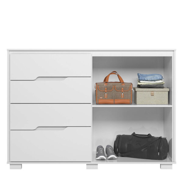 Conta com 4 gavetas equipadas com corrediças telescópicas, que proporcionam abertura suave, maior resistência e praticidade no uso diário. As portas possuem dobradiças de 35mm com amortecedor, garantindo fechamento silencioso e maior durabilidade.