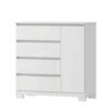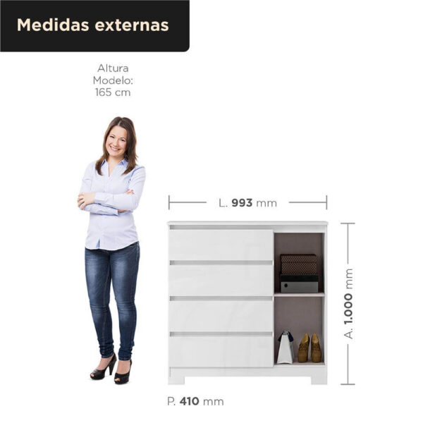Pensada para a rotina, ela conta com corrediças telescópicas, que proporcionam abertura suave e segura das gavetas, reforçando a qualidade e a robustez do produto. São 4 gavetas amplas, ideais para organizar roupas, acessórios e itens pessoais, além de 1 porta pivotante, que dá acesso a um amplo espaço interno, oferecendo ainda mais versatilidade no armazenamento.