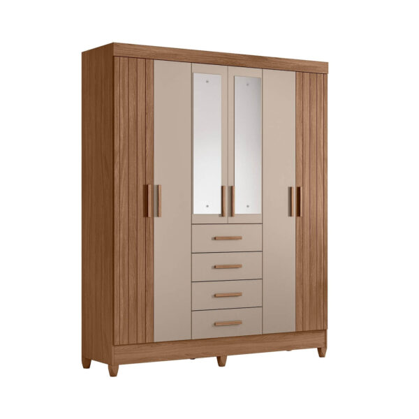Os puxadores em MDF complementam o acabamento do móvel, enquanto os pés em PVC facilitam a limpeza do ambiente, trazendo mais comodidade para a rotina. Além disso, o modelo possui espelhos opcionais, permitindo personalizar o guarda-roupa conforme a necessidade e o estilo do quarto.