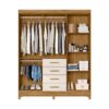 Conta com 4 gavetas equipadas com corrediças metálicas, garantindo abertura suave e maior durabilidade. O espaço interno é muito bem distribuído, com cabideiros e calceiro em alumínio, ideais para organizar roupas longas, camisas, calças e acessórios de forma prática e eficiente.
