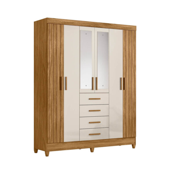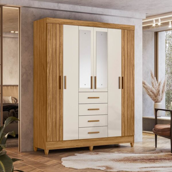 Os puxadores em MDF complementam o acabamento do móvel, enquanto os pés em PVC facilitam a limpeza do ambiente, trazendo mais comodidade para a rotina. Além disso, o modelo possui espelhos opcionais, permitindo personalizar o guarda-roupa conforme a necessidade e o estilo do quarto.