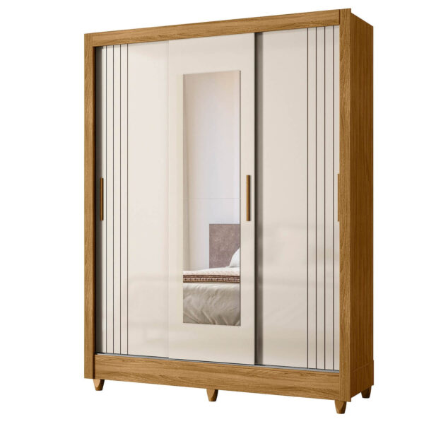 Os puxadores em MDF harmonizam com o design do guarda-roupa, enquanto os espelhos inclusos ampliam visualmente o ambiente e agregam funcionalidade ao móvel. Para completar, os pés em PVC facilitam a limpeza do espaço, trazendo mais comodidade para a rotina.