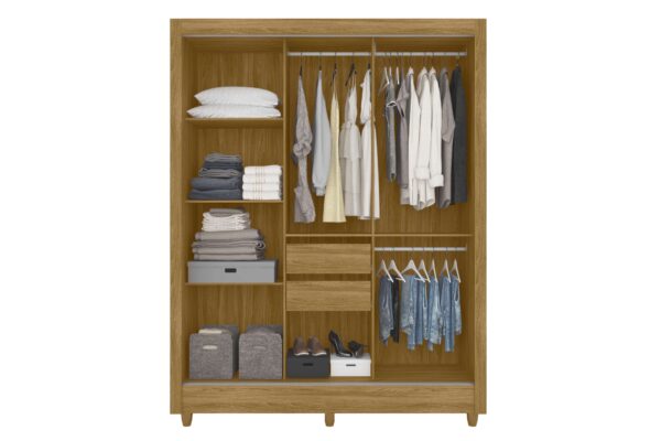 Internamente, o móvel oferece excelente organização, com 2 gavetas equipadas com corrediças metálicas, ideais para roupas dobradas e acessórios. Os cabideiros e calceiro em alumínio proporcionam praticidade no dia a dia, mantendo as peças sempre bem distribuídas.