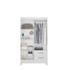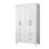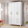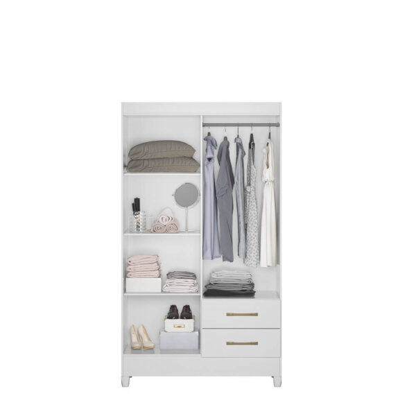 Seu design conta com 4 portas de giro, equipadas com dobradiças metálicas, que garantem abertura suave e maior durabilidade. Internamente, o móvel dispõe de cabideiro, facilitando a organização de roupas longas e curtas, além de 2 gavetas com corrediças metálicas, ideais para armazenar roupas dobradas, acessórios e itens pessoais com praticidade.