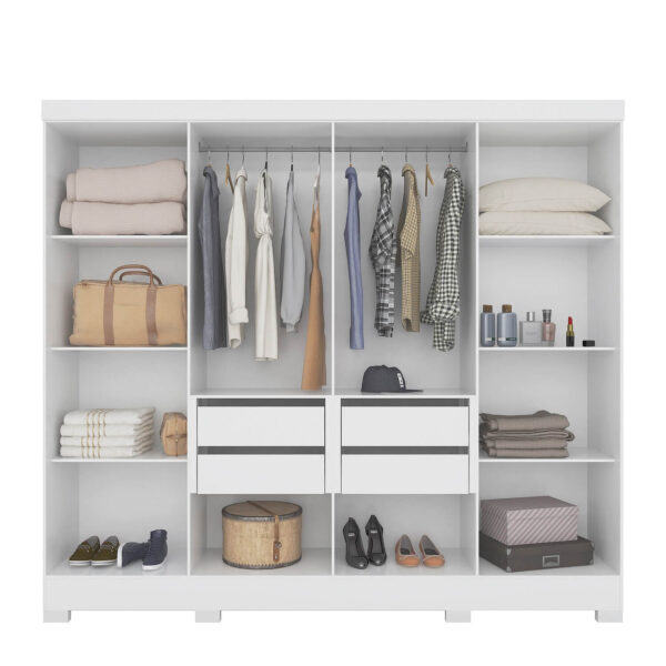 São 8 portas de giro com dobradiças metálicas, que garantem abertura suave, resistência e durabilidade. Internamente, o modelo conta com cabideiros em alumínio, perfeitos para acomodar roupas longas e curtas, além de 4 gavetas com corrediças metálicas, que oferecem praticidade no armazenamento de peças dobradas e objetos menores.