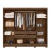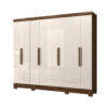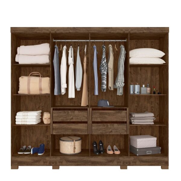 São 8 portas de giro com dobradiças metálicas, que garantem abertura suave, resistência e durabilidade. Internamente, o modelo conta com cabideiros em alumínio, perfeitos para acomodar roupas longas e curtas, além de 4 gavetas com corrediças metálicas, que oferecem praticidade no armazenamento de peças dobradas e objetos menores.