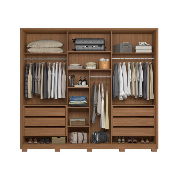 Possui 6 gavetas com corrediças telescópicas, que permitem abertura total e melhor visualização dos itens armazenados. O modelo ainda conta com maleiros espaçosos, cabideiros em alumínio e sistema anti-empeno metálico reforçado, garantindo mais resistência e vida útil ao móvel.