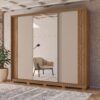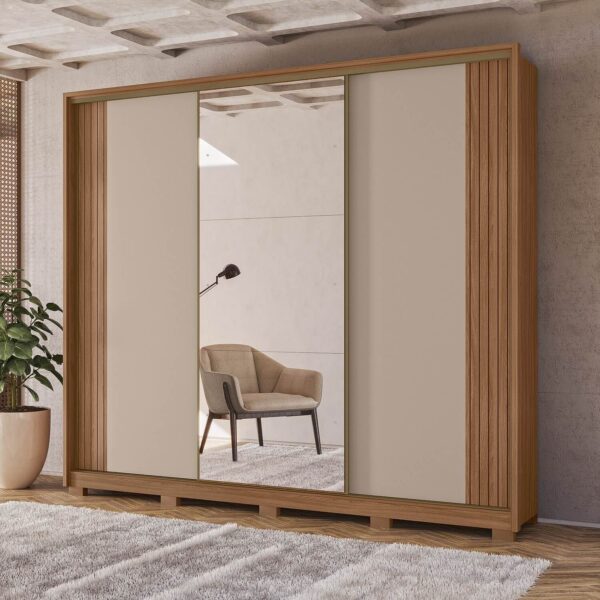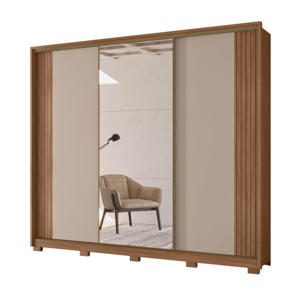 Conta com portas deslizantes com trilho inferior em alumínio, que proporcionam deslizamento suave e maior durabilidade. A porta central com espelhos amplia o ambiente e traz mais sofisticação ao espaço.