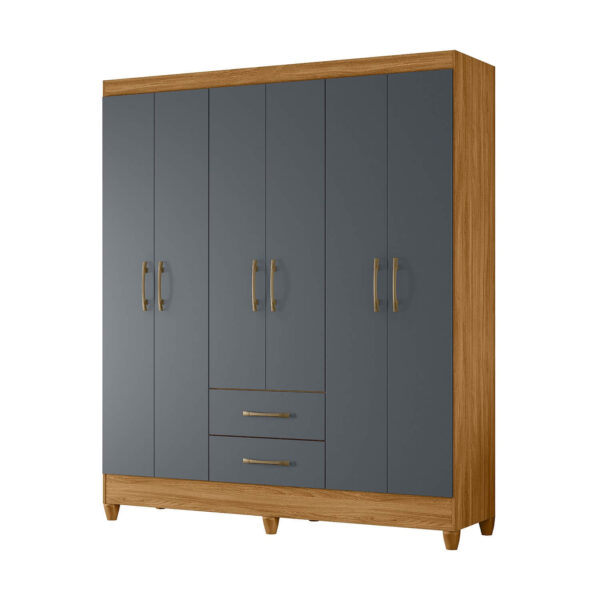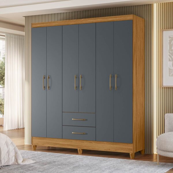 Com 6 portas de giro equipadas com dobradiças metálicas, o móvel oferece acesso fácil e prático a todos os compartimentos internos. Possui cabideiro interno, ideal para acomodar roupas longas e curtas de forma organizada, além de 2 gavetas com corrediças metálicas, que garantem abertura suave e resistência no uso contínuo.