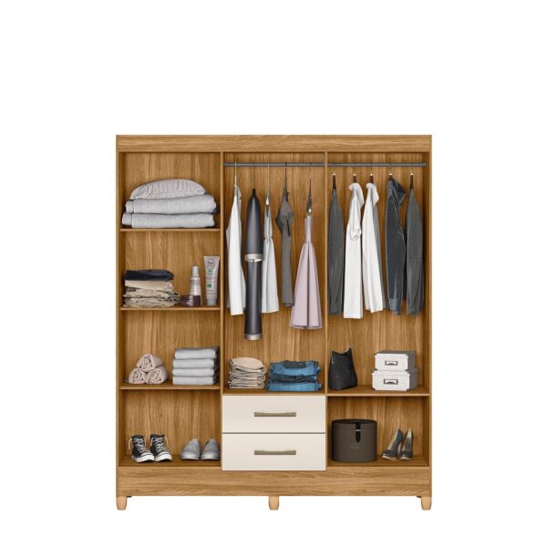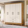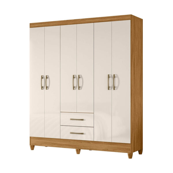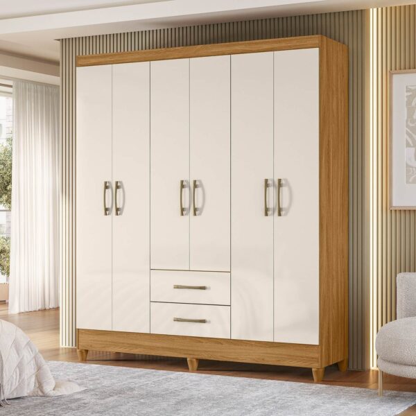 Com 6 portas de giro equipadas com dobradiças metálicas, o móvel oferece acesso fácil e prático a todos os compartimentos internos. Possui cabideiro interno, ideal para acomodar roupas longas e curtas de forma organizada, além de 2 gavetas com corrediças metálicas, que garantem abertura suave e resistência no uso contínuo.