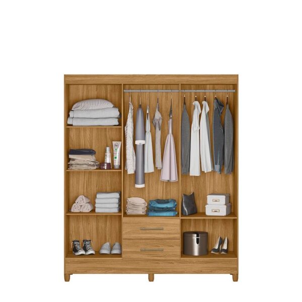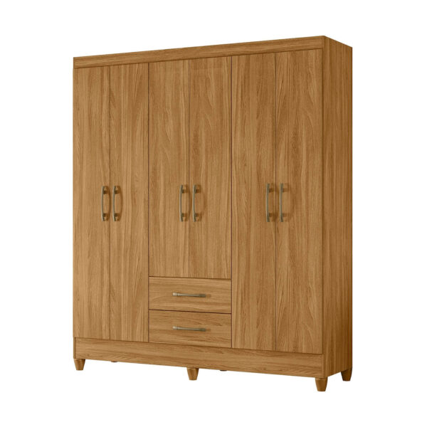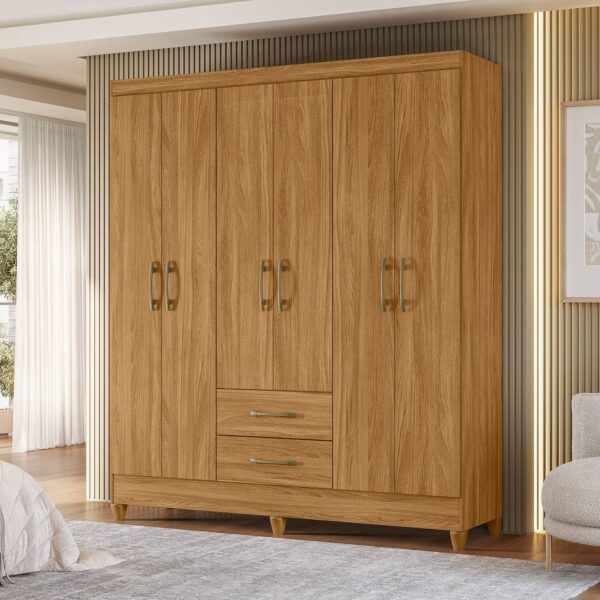Com 6 portas de giro equipadas com dobradiças metálicas, o móvel oferece acesso fácil e prático a todos os compartimentos internos. Possui cabideiro interno, ideal para acomodar roupas longas e curtas de forma organizada, além de 2 gavetas com corrediças metálicas, que garantem abertura suave e resistência no uso contínuo.