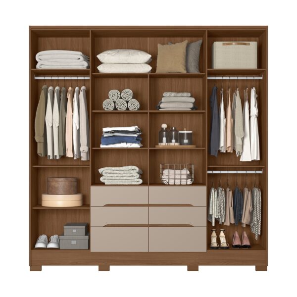 Guarda-Roupa San Francisco com 6 portas e 6 gavetas com corrediças telescópicas, cabideiros e calceiro em alumínio, maleiros espaçosos e excelente distribuição interna. Funcionalidade e muito espaço para o seu quarto.