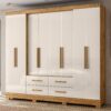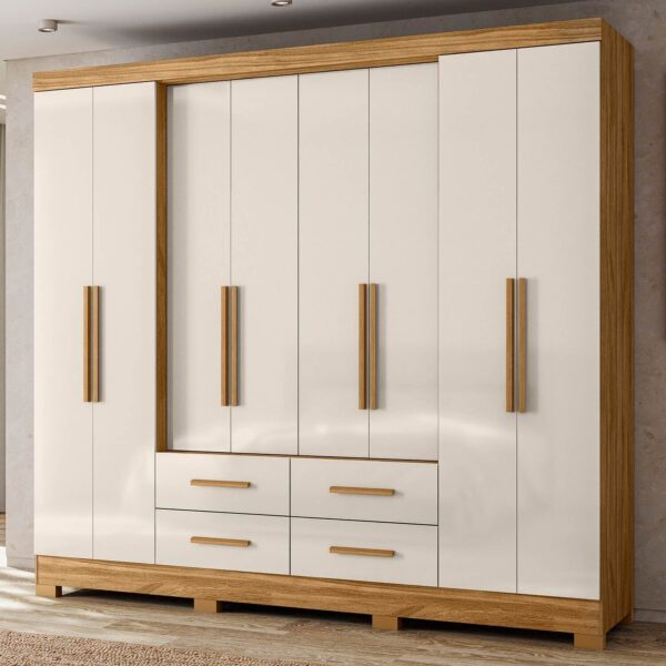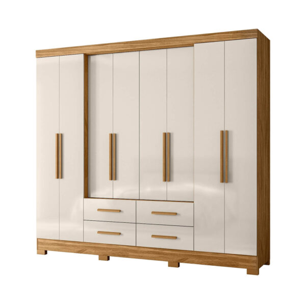Com 8 portas equipadas com puxadores em MDF, o móvel apresenta um visual moderno e bem distribuído. As portas laterais avançadas são um diferencial que facilita o acesso e melhora a circulação no interior do guarda-roupa. Para complementar a organização, ele conta com 4 gavetas com corrediças telescópicas, que garantem abertura suave, resistência e durabilidade.