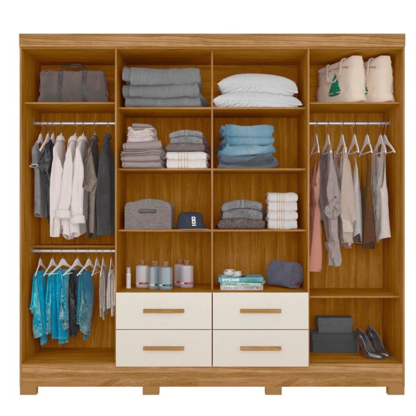 Internamente, o San Lorenzo se destaca pela excelente distribuição interna, oferecendo cabideiros e calceiro em alumínio, ideais para manter roupas longas, calças e peças delicadas sempre bem organizadas. Os maleiros espaçosos permitem armazenar roupas de cama, cobertores, malas e itens de uso ocasional com facilidade.