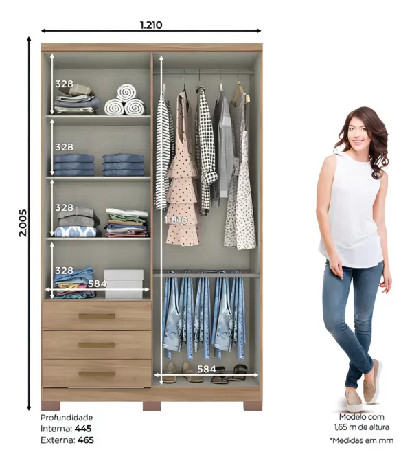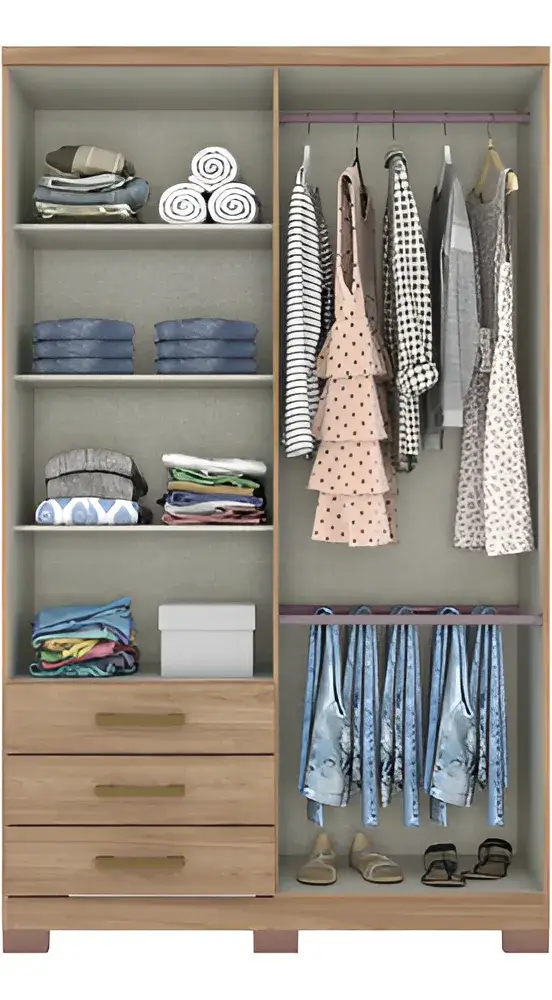 Seu interior é equipado com cabideiro em madeira revestida, oferecendo resistência e segurança para pendurar roupas, além de gavetas com corrediças metálicas, que garantem abertura suave, durabilidade e praticidade no uso diário. As quatro portas facilitam o acesso aos compartimentos internos, tornando a organização ainda mais eficiente.