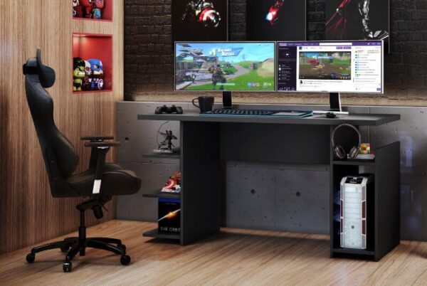 A Mesa Gamer NT 2065 foi desenvolvida para oferecer desempenho, organização e estilo ao seu setup gamer. Ideal para quem utiliza dois monitores, ela conta com tampo robusto de 25mm, garantindo resistência, estabilidade e segurança para longas horas de jogo ou trabalho.