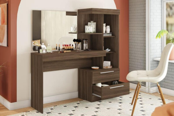 Conta com duas gavetas espaçosas, ideais para manter documentos, acessórios e itens pessoais sempre organizados e ao alcance das mãos. Além disso, possui nicho funcional, perfeito para livros, caixas organizadoras ou objetos de decoração, trazendo mais personalidade ao ambiente.