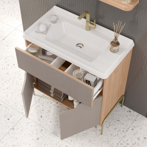 O kit possui pés em estrutura metálica, que garantem estabilidade, durabilidade e facilitam a limpeza do ambiente. Além disso, conta com corrediças telescópicas e dobradiças com amortecedor, proporcionando abertura suave e maior vida útil ao móvel. Os detalhes canelados agregam charme e sofisticação ao design.