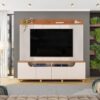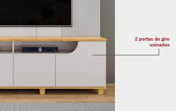 Projetado para acomodar TVs de até 75 polegadas, o painel suporta até 40 kg, oferecendo segurança e estabilidade. Os pés em poliestireno dourado acrescentam um toque sofisticado e contemporâneo, elevando o visual do móvel.