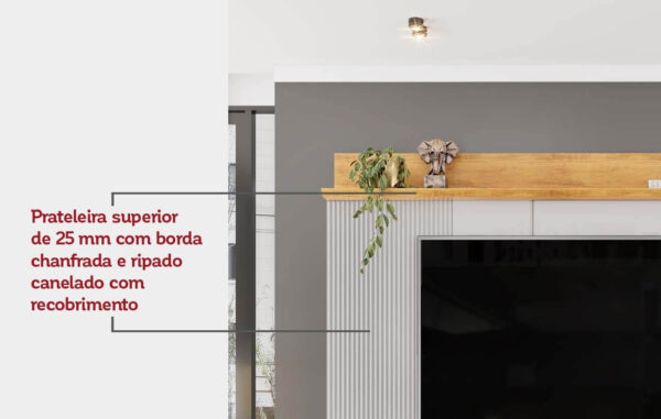 O painel se destaca pelos ripados canelados nas extremidades, que emolduram a TV com charme e modernidade. A prateleira superior com borda chanfrada oferece um espaço elegante para expor objetos decorativos, livros e itens que trazem identidade ao ambiente, enquanto sua profundidade garante praticidade no dia a dia.