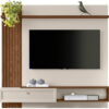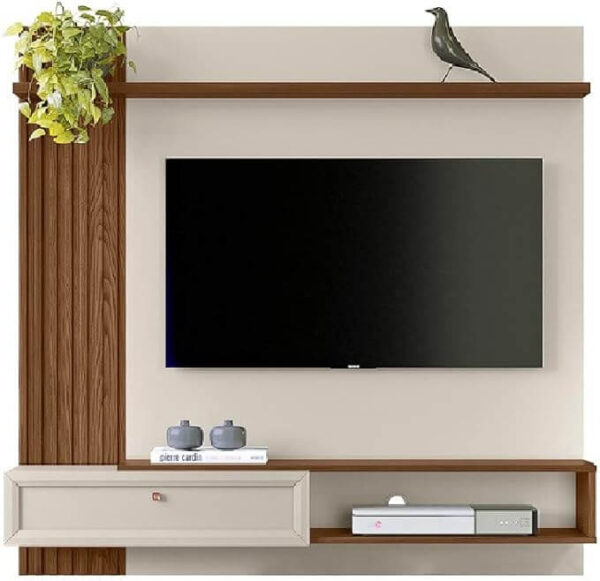 Projetado para TVs de até 55 polegadas, o painel conta com prateleira superior flutuante, perfeita para acomodar objetos decorativos, livros ou itens pessoais, além de um nicho funcional para aparelhos eletrônicos como receptores, videogames ou soundbars. A porta basculante em estilo americano adiciona praticidade ao dia a dia, permitindo guardar objetos de forma discreta e organizada.