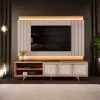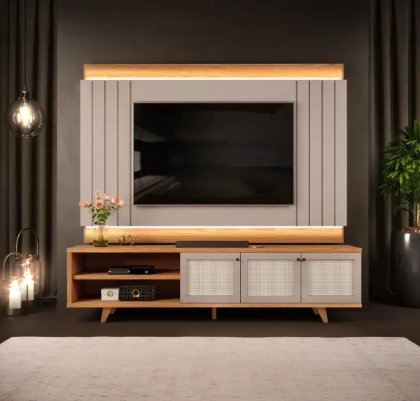 Os pés em madeira maciça garantem resistência, durabilidade e um acabamento de alto padrão. O painel foi projetado para suportar TVs de até 75 polegadas, tornando o conjunto perfeito para quem busca conforto, estilo e praticidade em um único móvel.