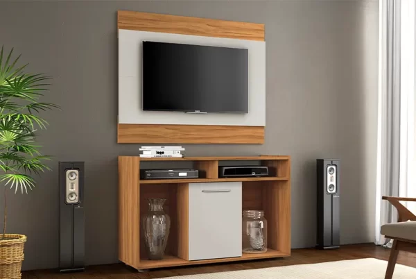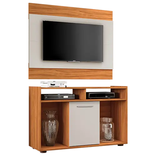 Sua estrutura resistente de 15mm garante durabilidade e estabilidade no uso diário. O conjunto conta com nichos amplos, perfeitos para acomodar aparelhos eletrônicos, objetos decorativos e itens de uso frequente, mantendo tudo organizado e ao alcance das mãos.