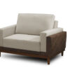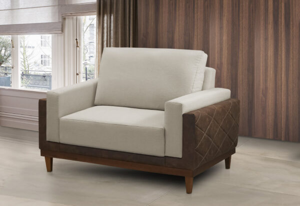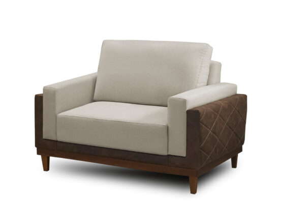 Sua estrutura em madeira de lei (eucalipto), devidamente tratada e aparelhada, conta com reforços e cantoneiras que garantem alta resistência, durabilidade e estabilidade. As percintas elásticas no encosto e no assento reforçam a sustentação e aumentam a vida útil do estofado.