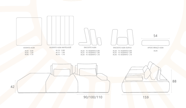 O conforto do Alba é resultado de um conjunto de materiais de alta qualidade. Seus assentos são compostos por espuma D28 Master + Fresh, revestidos com manta de fibra de poliéster de 200g/m³, oferecendo uma acomodação confortável, fresca e agradável ao corpo. Essa composição proporciona suporte equilibrado, ideal tanto para relaxar quanto para momentos de convivência.
