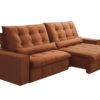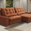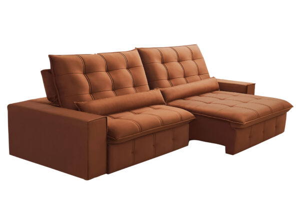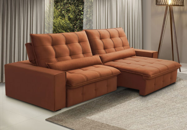O encosto reclinável, preenchido com 100% de fibras siliconadas, adapta-se ao corpo, permitindo diferentes posições para relaxar com total conforto. Já os braços removíveis, confeccionados com espuma D-20, oferecem versatilidade, facilitando o transporte e a adaptação do sofá ao ambiente.