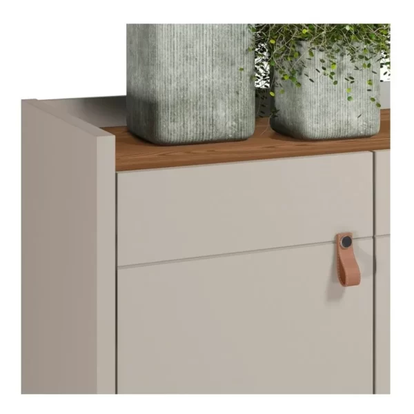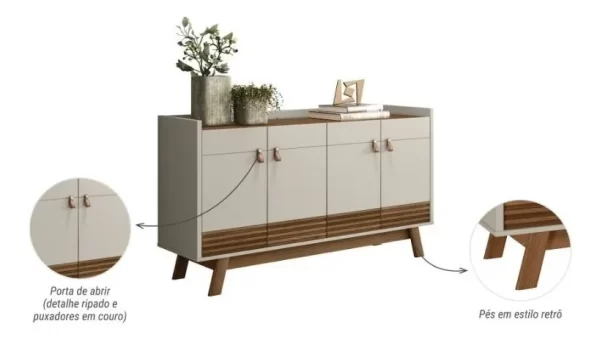Os puxadores em couro sintético trazem um toque diferenciado e refinado, valorizando ainda mais o acabamento do móvel. Internamente, o buffet conta com duas prateleiras em MDP, ideais para organizar louças, utensílios, objetos decorativos ou itens do dia a dia que não precisam ficar à vista.